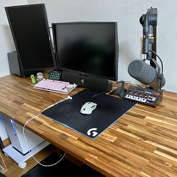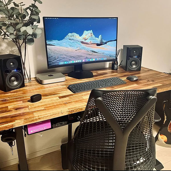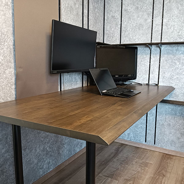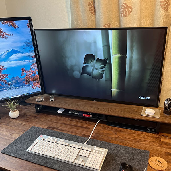2.電動式昇降のPCデスク800×2000mmという大きめのウォールナット材を天板に使用したPCデスク。脚は電動昇降脚で、座る人や椅子に合わせて昇降することができます。広めのデスクだからこそ、複数のガジェットやグリーンを設置した優雅な作業空間に仕上がっています。 |