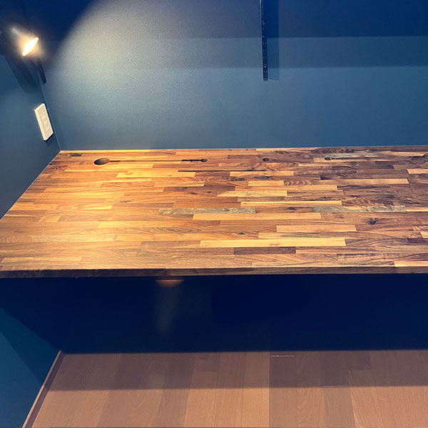 5.書斎用のカウンターデスク壁幅ぴったりにオーダーした、ウォールナット集成材の書斎用のデスク天板。品切れで白太有りの板にしたところ、かえって気に入ったとのこと。木材の変化のある美しさがよく分かる作品です。 |