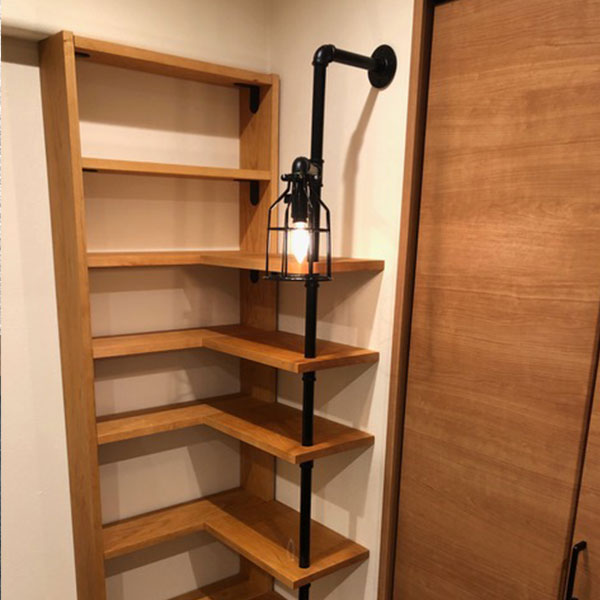 8.デッドスペースにL字型の棚何かと物が溜まりがちな寝室にランタン付きの棚をDIYした作品です。L字にすることでうまく空間を利用されていて、収納力も抜群です。 |