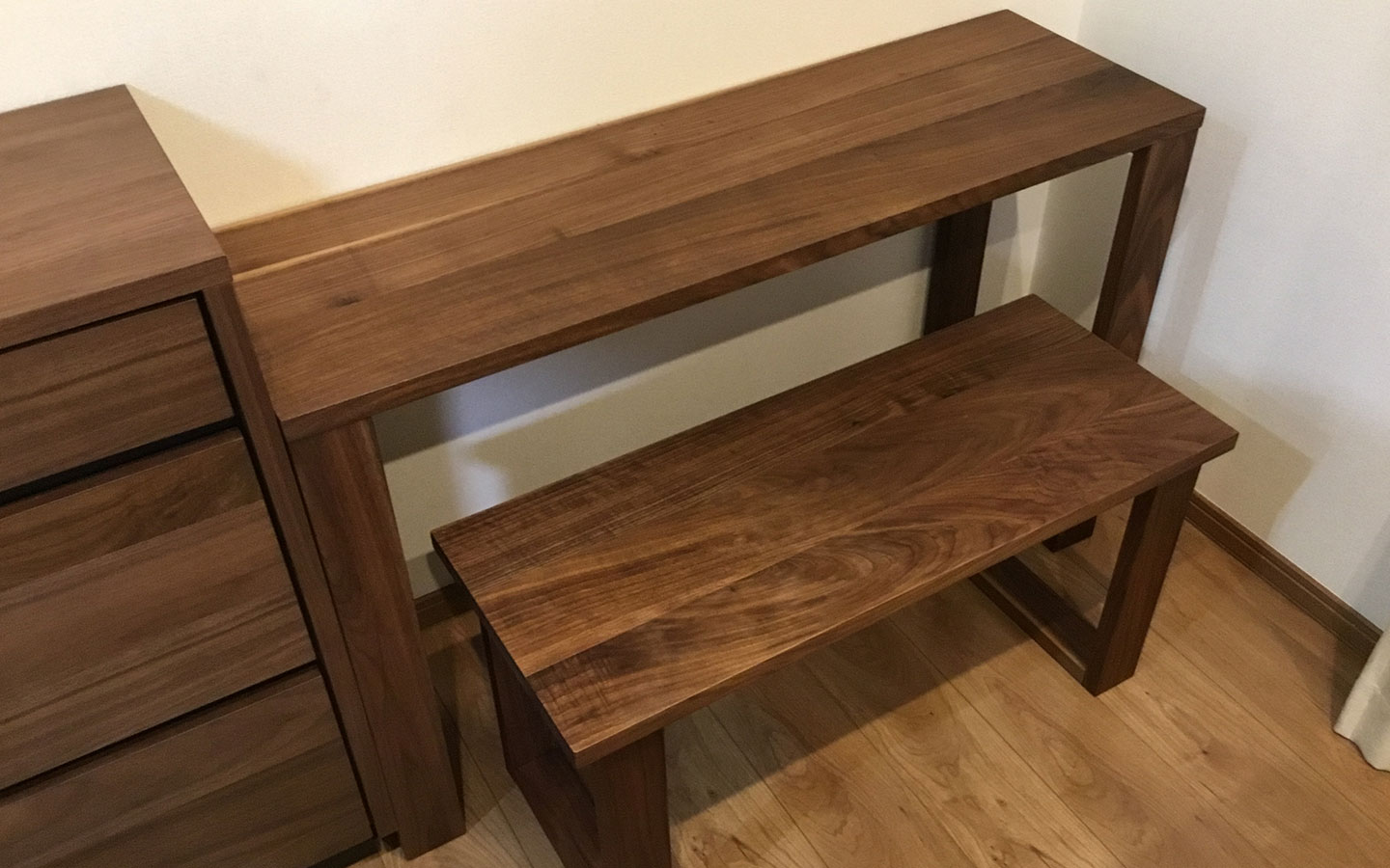 ウォールナット材は美しいだけでなく耐久性も高いことから、世界各地で家具づくりの材料として使用されています。およそタモやブラックチェリーと言った他の家具材と遜色ない密度を持ったしっかりした木材なので、椅子や天板などの耐荷重の必要な用途にも使用でき、傷もつきにくいです。ある程度粘りのある材質なので割れにも強く、小物や細工物にもよく使用されます。