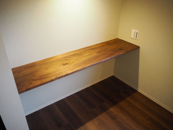 ウォールナット材はその仕上がりの良さでも有名な木材。しっかりと目の細かい番手のペーパーで表面を仕上げ、オイルやワックスで仕上げれば比喩ではなく輝くようなツヤが出ます。木材自体の繊維が細かいので、磨くほどに表面はなめらかに。ザラザラと指がひっかることのないすべすべとした触り心地は、直接肌の触れるテーブル天板や椅子などにぴったりです。価格が高いので採用率としては高くありませんが、表面がなめらかで木材自体に粘りがある(よくしなって弾力がある)ウォールナット材は、フローリングにもおすすめしたい樹種になります。