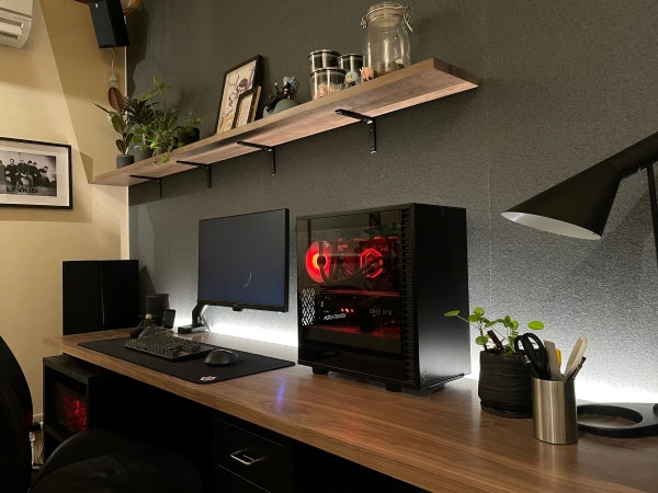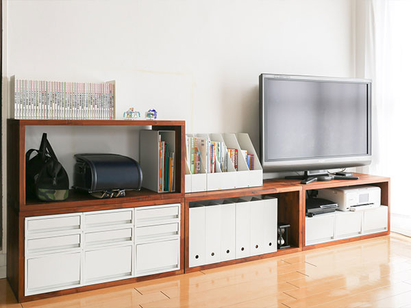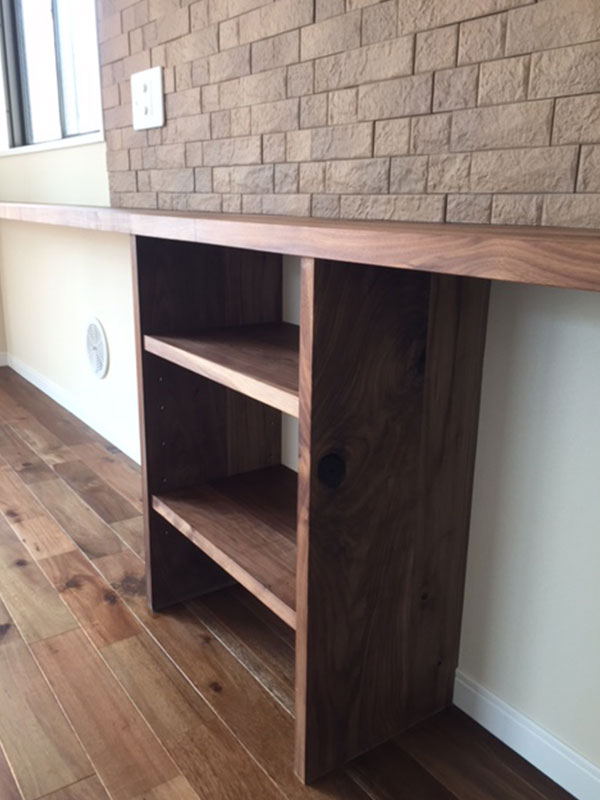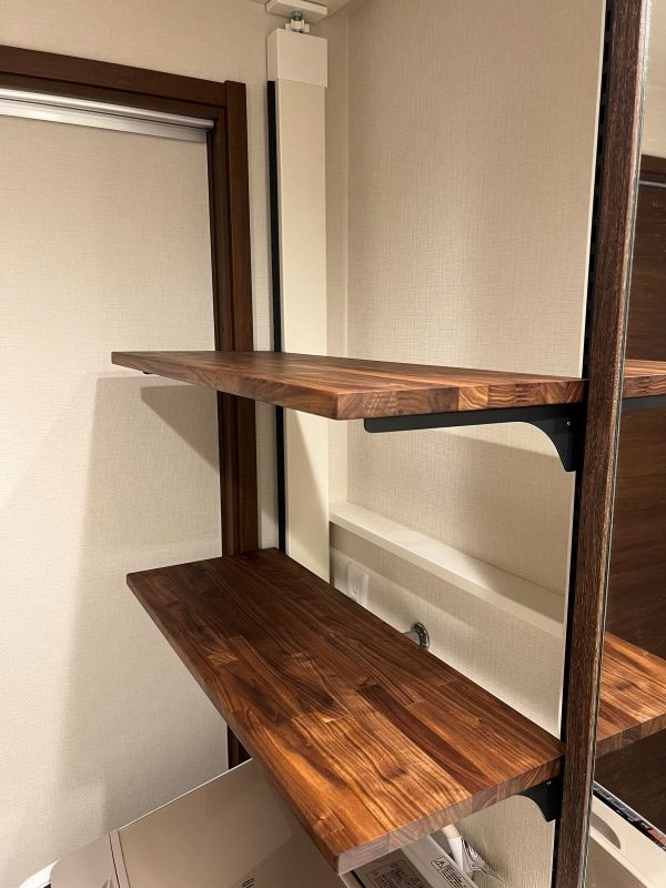 見た目が美しいウォールナット材は、インテリアの一部として”見せる収納”の棚板などにチョイスされることが多いです。濃い色がアクセントとなって、部屋を引き締めてくれます。