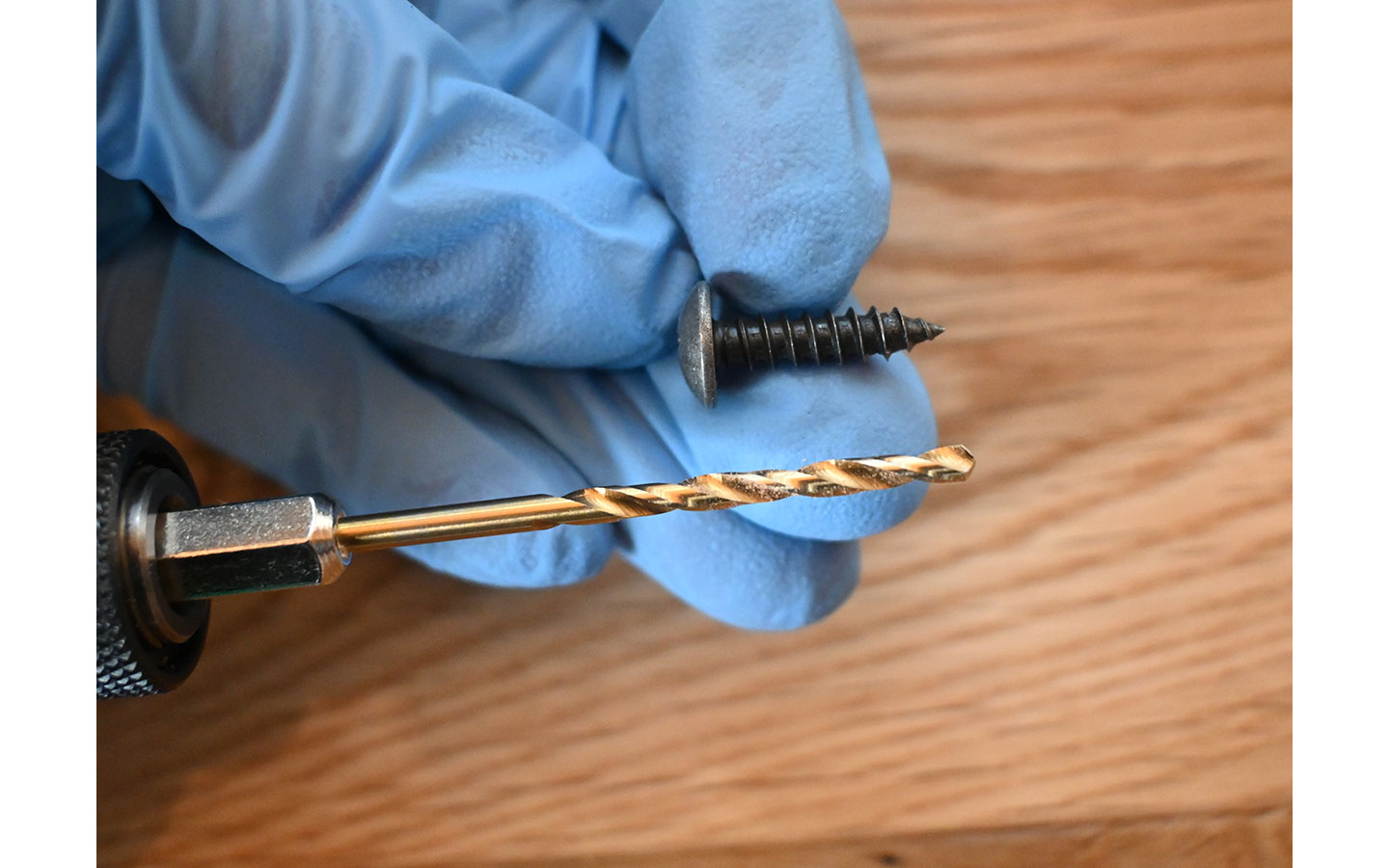 下穴はビスの長さを考慮して開けます。あまり浅いとビスが途中で入らなくなったり、板の割れに繋がるので、ドリルビットのどの辺まで穴を開ければ良いのかはあらかじめ見てから作業しましょう。