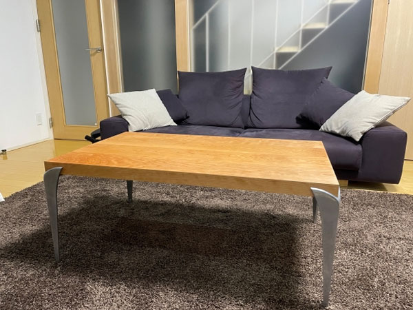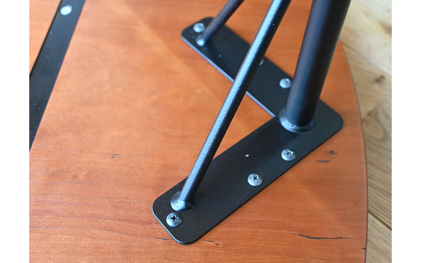 今回の天板は反りどめが入っているのですが、もしもマルトクショップ で天板をご注文いただく場合には、この脚の配置と反りどめの位置はよくよく考えた方が良いです。金物同士が干渉してしまうと泣く泣くデザインを変えることになってしまうので、天板より前に脚を入手して、配置を考えてから天板のオーダーをするのをおすすめします。