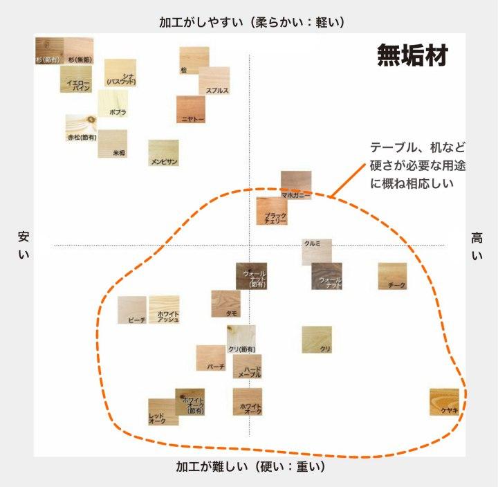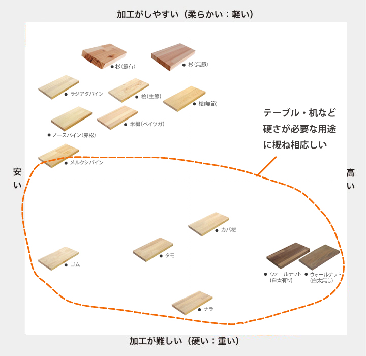 木材の固さや木目、価格を一覧でご覧になりたい場合はチャートのページをご用意しておりますのでぜひご参照ください。