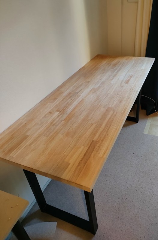 リモートワーク用に作成しました。蜜蝋ワックスを塗ってアイアンの足を取り付けるだけの簡単なDIYでしたが、木の雰囲気を感じられてとても気に入っています。ゴム集成材は硬いので、字を書くときにも重宝しています。
