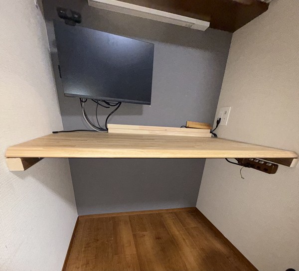 机は、脚無しで壁掛けを考えていました。長さと奥行きが入らないほど長くないか心配でしたが、見事にサイズ通りで感動しました。もう5mmの長さでぴったりになるのですが、家の壁が真っ直ぐとは限らないので、やめておいて正解でした。