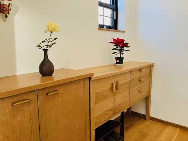 引き出しの見た目も可愛らしく、お花もあって、玄関が華やかなお出迎えの場になっているのが伝わります。