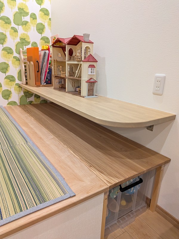 小上がり畳にある机の下を収納スペースにしました。机は子供の遊び場で、物をよく下に落としていたのでタモ板で塞ぎました。