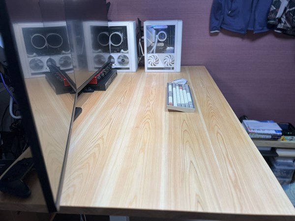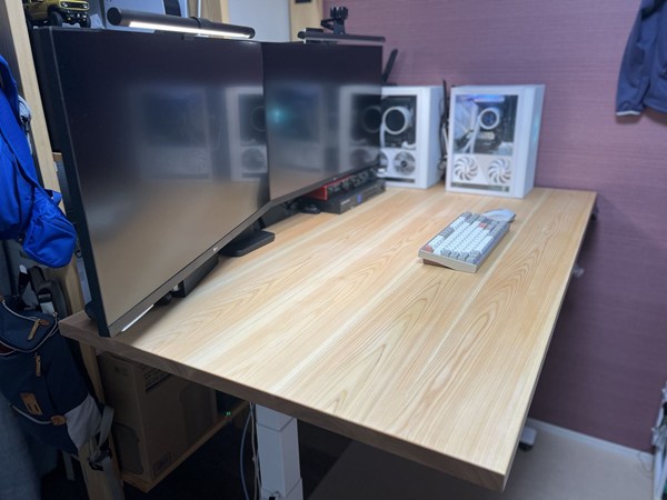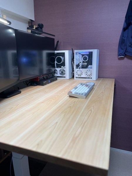 桧の無垢材(節無)で電動昇降デスクの天板にしました。このデスクで仕事から食事、YouTubeなどの娯楽など日常の大半を過ごすため、 大きめのサイズにして、塗装とワックスは自分で実施したためより愛着が沸いてお気に入りです。