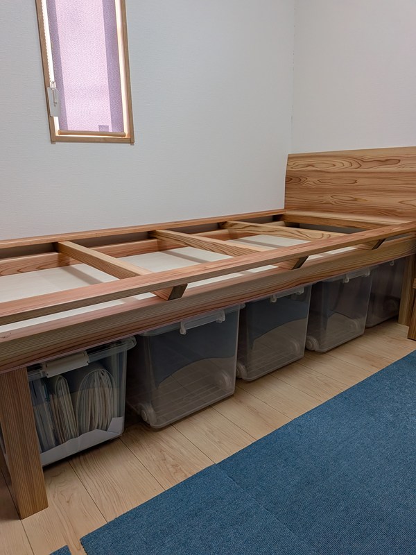 収納スペースがあって、掃除がしやすく、湿気対策ができる、そんなベッドが欲しくて作りました。収納ケース390×740×350が5つ入ります。