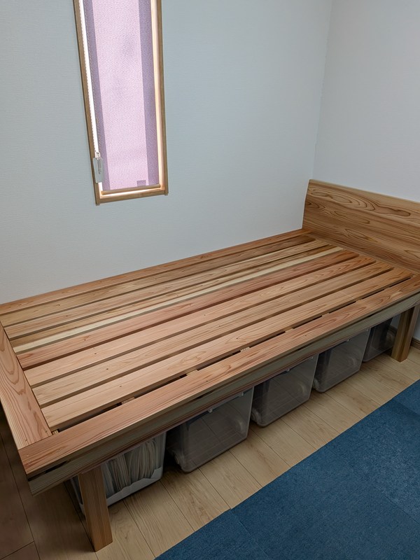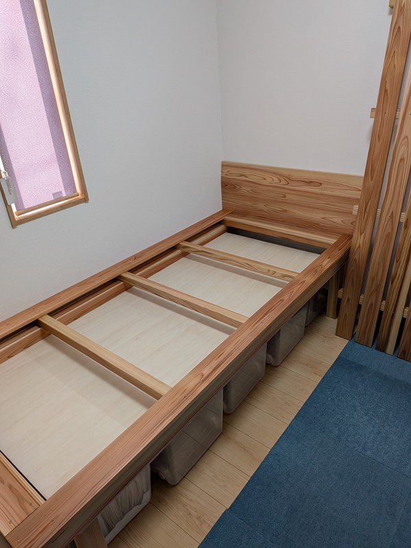 収納スペースがあって、掃除がしやすく、湿気対策ができる、そんなベッドが欲しくて作りました。収納ケース390×740×350が5つ入ります。