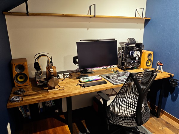 スタイリッシュなデザインの椅子やオープンフレームのPCやスピーカーなど「映えるデスク」の天板に弊社の木材を選んで頂いて誠に光栄です。