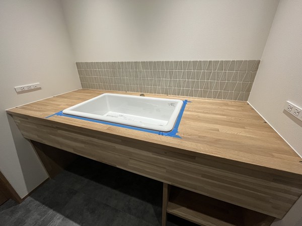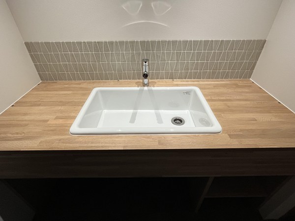 下側に棚もあって機能的で、素晴らしい洗面台に仕上がったとお見受けいたします。